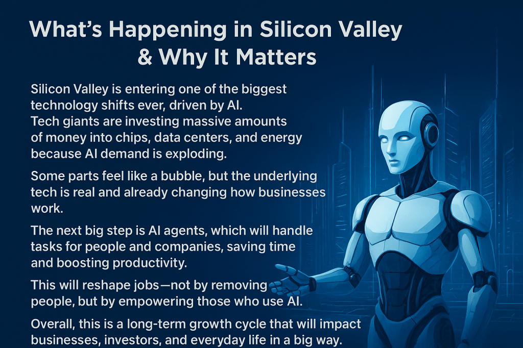 Silicon Valley is entering one of the biggest technology shifts ever, driven by AI. Tech giants are investing massive amounts of money into chips, data centers, and energy because AI demand is exploding. Some parts feel like a bubble, but the underlying tech is real and already changing how businesses work. The next big step is AI agents, which will handle tasks for people and companies, saving time and boosting productivity. This will reshape jobs—not by removing people, but by empowering those who use AI. It’s also creating huge demand for clean energy, new regulations, and global competition as countries race to lead in AI. Overall, this is a long-term growth cycle that will impact businesses, investors, and everyday life in a big way.