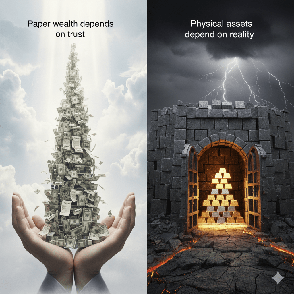 Paper wealth depends on trust; physical assets depend on reality.